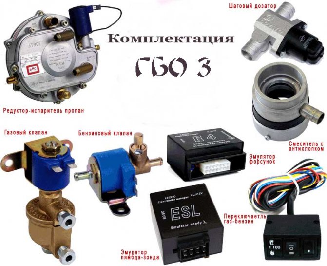 - ГБО-3 — система для инжекторных двигателей, в которых редуктор оснащён контроллерами и работает в полностью автоматическом режиме. Он считывает показания датчика кислорода в выхлопных газах и по ним регулирует состав газовой смеси. Также редуктор имеет датчик температуры, который позволяет ему включаться только после прогрева. Ещё одно усовершенствование ГБО-3 — это эмуляторы форсунок. Они имитируют работу бензиновых форсунок, чтобы электронный блок не перевёл двигатель в аварийный режим. Эмуляторы форсунок убрали необходимость встраивать в систему отдельный бензиновый клапан.