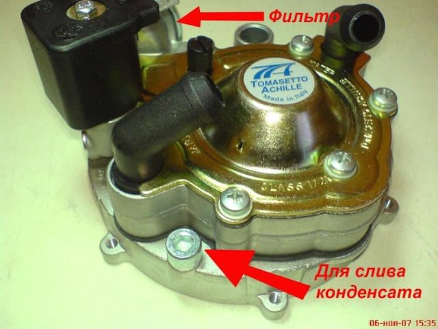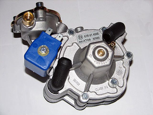 Для регулировки давления газа, поступающего к форсункам, следует использовать редуктор-испаритель. Это устройство, которое позволяет снизить давление, находящееся в газовом баллоне, до значения, необходимого для работы электромагнитных форсунок.