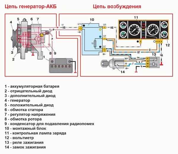 Для начала, немного теории: при работе двигателя подсевший аккумулятор заряжается постоянным напряжением в 13,6-14,2 В от бортовой сети автомобиля через генератор. Из-за разной частоты оборотов коленчатого вала двигателя для поддержания указанного напряжения в цепь возбуждения генератора включен регулятор напряжения (РР, «таблетка», «шоколадка»), которое при повышении напряжения в сети выше номинального уменьшает ток, идущий на обмотку возбуждения генератора. Намагничивание полюсов ротора уменьшается, что приводит к понижению его выходного напряжения. Поэтому причины того, что генератор не дает зарядку на аккумулятор, связаны с элементами «цепи возбуждения» или же цепи выходного напряжения «генератор-аккумуляторная батарея», включая и сам генератор. Когда включается зажигание, замок (14) включает и реле зажигания (13). При этом +12В от аккумуляторной батареи (1) проходят через контакты реле и предохранитель №10 монтажного блока, затем подаются в бортовую сеть и на вывод контрольной лампы заряда (11) аккумулятора и датчика зарядки в панели приборов (12). После этого они идут через диод, монтажный блок (10) (штекеры Ш5-Ш10), подаются на штекер «61» генератора и попадают на клемму встроенного РР (7) и через щетку и контактное кольцо на обмотку возбуждения (8) — производится стартовое возбуждение генератора (4). При увеличении частоты оборотов двигателя, а с ним и ротора генератора, фазовое напряжение возрастает, и оно через блок дополнительных диодов (3) повышает напряжение на обмотке возбуждения и на выходном диоде контрольной лампочки зарядки аккумулятора. При достижении выходного фазового напряжения до +12В на обеих выводах лампы АКБ напряжение выравнивается, и из-за отсутствия разности напряжений она гаснет (как при заводке автомобиля). При этом генератор вырабатывает напряжение больше 12В, которое заряжает АКБ через выход «30».