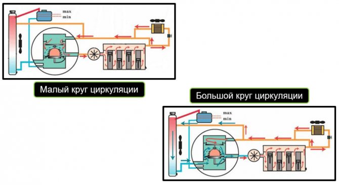 Схема циркуляции охлаждающей жидкости состоит из большого и маленького круга. К малому относятся только рубашка охлаждения и радиатор, там требуется меньшее количество жидкости.