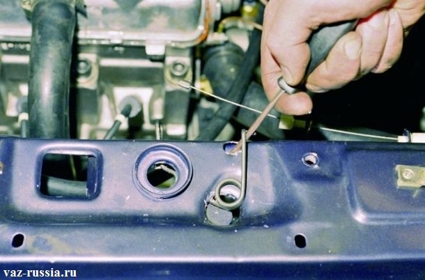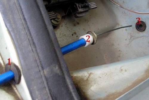 5) Теперь переберитесь к подкапотному пространству, и в моторный отсек выведите трос привода.