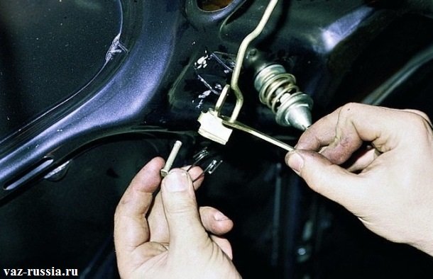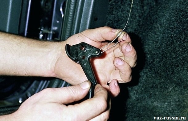 - Осталось удалить порванный кабель и заменить его на новый. Помощник должен вытащить пружинный механизм возле замка, а затем владелец автомобиля фиксирует трос на рукоятке механизма блокировки.