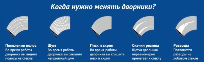 Маркером для скорейшей замены деталей является скрежет по стеклу. Такое происходит при сильном обезжиривании лобового стекла или деформации рабочей части дворника. В первом случае это устраняют повторной мойкой, во втором – замена деталей обязательна.