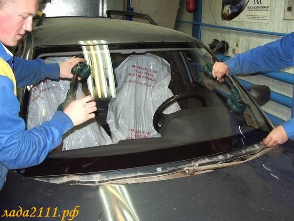 Надо знать, что на «Приоре», в отличие от моделей ВАЗ, предшествующих «десятой» серии, лобовое стекло не имеет прилегающей резинки. Стекло сажается непосредственно на клей, наложенный на посадочный борт кузова. Поэтому оно называется клееным. Этим определяется набор инструментов и приспособлений для замены лобового стекла «Приоры»: