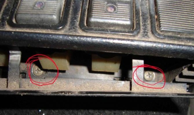 - Над панелью с прикуривателем есть ещё одна панель, с кнопками. Она снизу поддевается плоской отвёрткой и отгибается вверх. Под ней есть два шурупа с шайбами, которые выкручиваются крестовой отвёрткой.