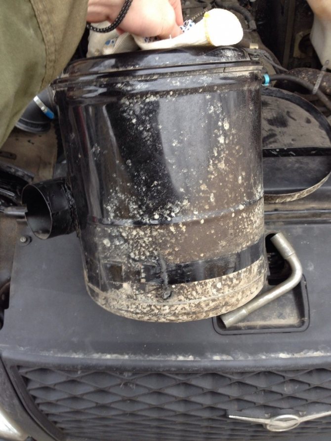 - Снимается крышка совместно с фильтрующим элементом. Внутреннее пространство корпуса и расходник тщательно анализируются. Возможно, он не сильно загрязнен и его можно еще эксплуатировать. Если же он загрязнен достаточно, его следует менять с меньшим интервалом пройденного километража.