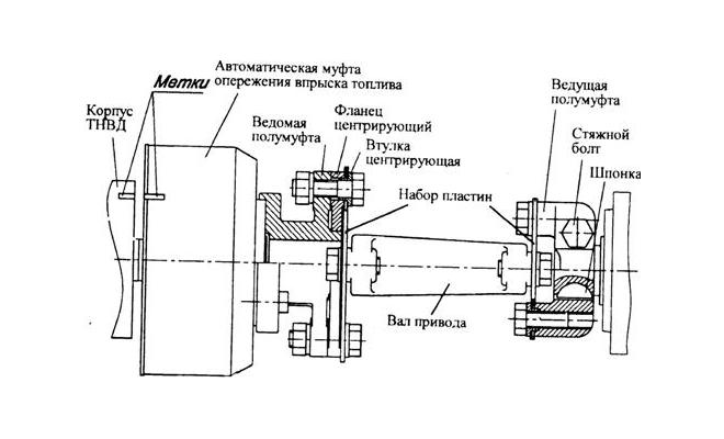На машинах Камского завода насос, подающий горючее под высоким давлением, устанавливается посредством шпонки сбоку коробки. Закрепление муфты насоса возможно в двух позициях, разница при этом составляет 180 град. Когда винт, прижимающий привод, находится вверху, то метки ТНВД и муфты насоса следует искать напротив.
