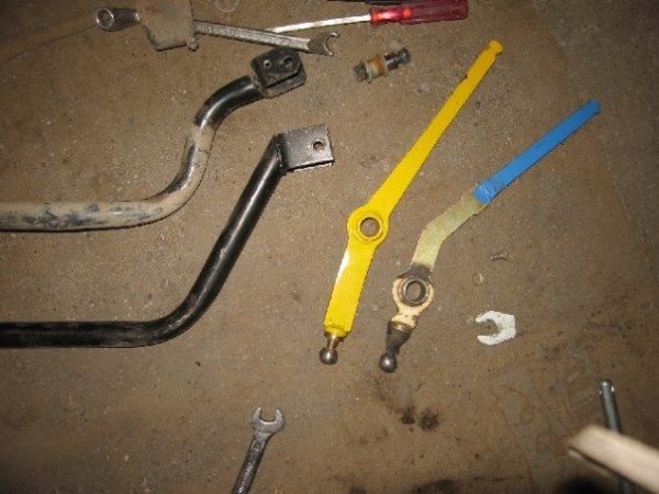 - Теперь можно будет извлечь рычаг вместе с тягой через салон. При необходимости их можно предварительно разъединить.