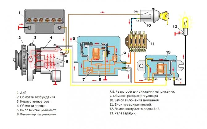 Во время работы двигателя крутится коленвал (или промвал), который через ремень передает энергию на электрогенератор и раскручивает его. Полученная энергия преобразуется в электрическую и поступает на контакты аккумуляторной батареи, тем самым поддерживая стабильное напряжение АКБ и предохраняя ее от разряда и выхода из строя.