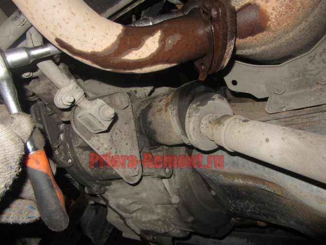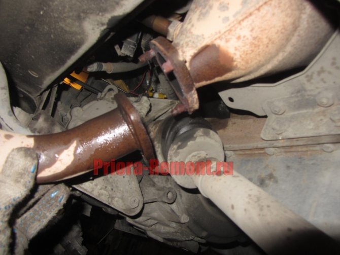 Прежде всего, откручиваем болты крепления резонатора к каталитическому нейтрализатору. Вытягиваем болты и разъединяем трубы.