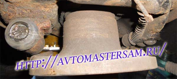 - Теперь приподнимаем заднюю часть транспортного средства и снимаем колесо. После разбираем тормозной механизм, отвинчиваем корпус и достаем тормозные колодки, предварительно отсоединив от верхней крючок, примыкающий к тросу от ручника. Теперь откроется доступ к тормозному диску, который также извлекаем, выкрутив все фиксирующие крепления;