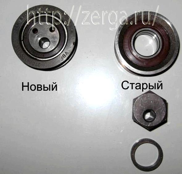 Натяжной ролик обязательно нуждается в замене. В нём установлены подшипники, которые смазываются один раз и смазки как правело, хватает до замены ремня грм. Есть два вида натяжных роликов старого и нового образца.