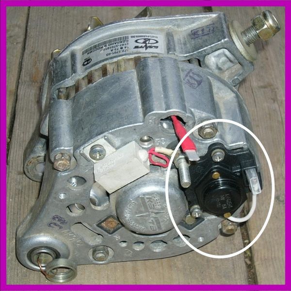 Реле зарядки находится на генераторе, на его задней крышке, и, какой бы формы и цвета не была «таблетка», из корпуса генератора к нему выходит жёлтый провод. Реле расположено так, что его можно заменить, не снимая генератор. Но на рисунках для удобства показана работа на снятом генераторе.