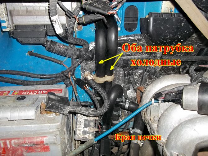 - Если входной патрубок также холодный, то нужно попробовать патрубок который идёт на радиатор из моторного отсека до краника. Если он горячий, значит, дело в неработающем кранике.