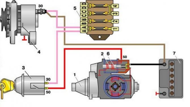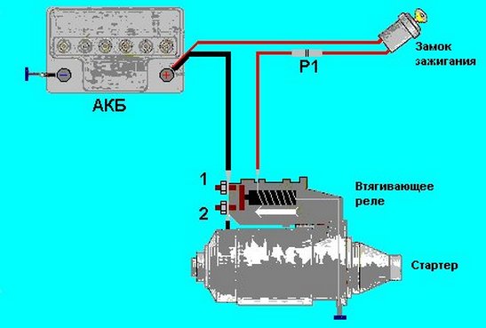 Провод с толстым сечением подводится к клемме силового контакта стартера, тонкий провод – от замка зажигания к обмоткам «втягивающего». Второй «пятак» соединён со статорной обмоткой мотора.