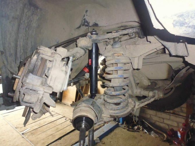 Это нужно сделать для откручивания нижнего крепления амортизатора, чтобы он не мешал демонтажу полуоси и не выпала пружина.