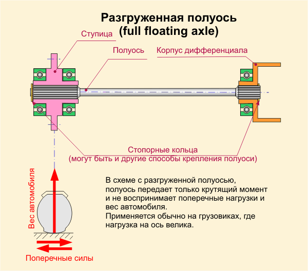 В схеме с разгруженной полуосью, полуось передает только крутящий момент и не воспринимает поперечные нагрузки и вес автомобиля. Применяется обычно на грузовиках, где нагрузка на ось велика. Плюсы: