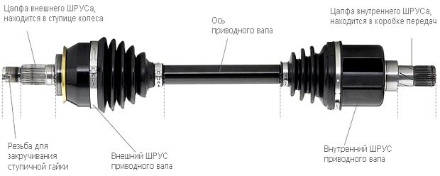 Устройство полуоси таково, что эффект передачи мощности будет максимальным при любом положении колёс. Данная конструкция состоит из трех частей: