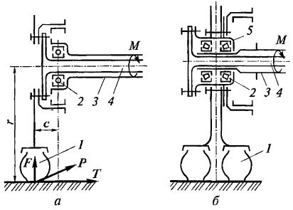 Вращающий момент от полуосевых шестерен дифференциала к ведущим колесам передается валами, называемыми полуосями. Помимо вращающего момента, полуоси могут быть нагружены изгибающими моментами от сил, действующих на ведущее колесо. Такими силами являются реакция дороги F от вертикальной нагрузки, приходящейся на колесо 1 (рис. а), сила тяги Р (или тормозная сила при торможении), боковая сила Т, возникающая при повороте и заносе. В зависимости от способа установки полуоси могут быть полностью или частично разгружены от изгибающих моментов, возникающих под действием перечисленных сил на расстояниях с и г соответственно.