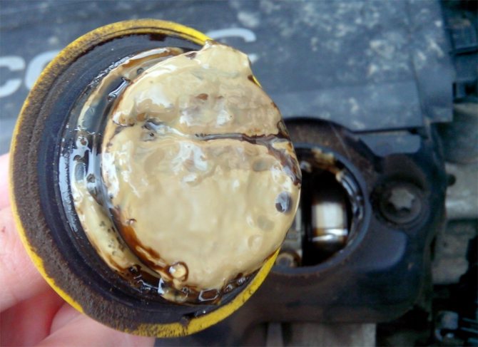 - Эмульсия на маслозаливной горловине. Она может напоминать густой «майонез».