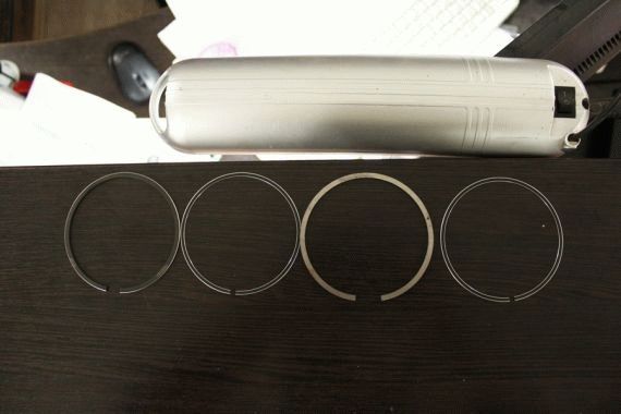 В первом случае понадобится нарезать несколько плоских кусочков жестянки, толщиной примерно от 0,3 до 0,5 мм. Три или четыре таких листа располагают по диаметру поршня. На них надеваются кольца. И опускаются до уровня прорези. Потом оправка для поршневых колец из пластин вынимается, и колечко садится в нужный паз. Способ прекрасно подходит для любого мастера.