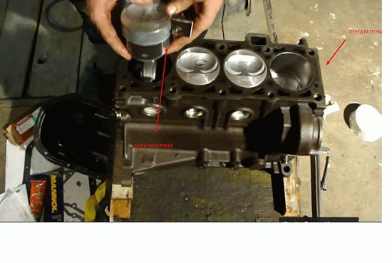 На поршне сверху есть специальная метка, которую нужно повернуть в сторону «передка» двигателя.