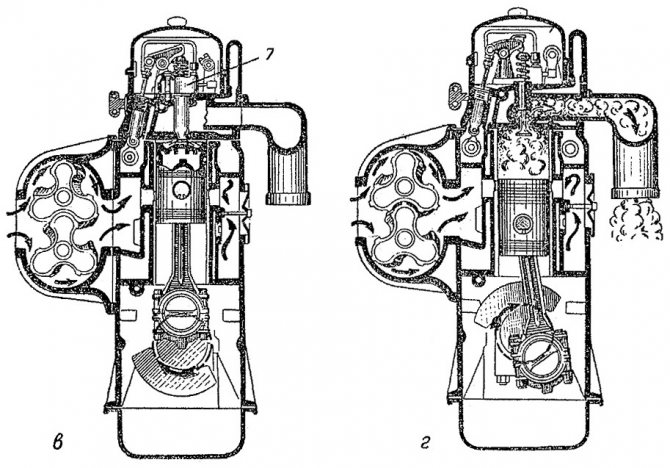 Рис. Основные процессы, происходящие в цилиндрах двухтактного дизеля: а — продувка; б — сжатие; в — рабочий ход; г — выпуск отработавших газов; 1 — поршень; 2 — нагнетатель; 3 — выпускной клапан; 4 — продувочные окна; 5 — ресивер блока; 6 — коленчатый вал; 7 — насос-форсунка