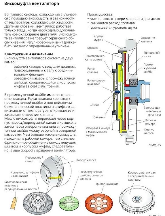 Вязкостная муфта работает в зависимости от температуры воздуха после радиатора системы охлаждения двигателя. Она регулируется биметаллической термопластиной, то есть включается при 61°C — 67°C, когда температуре тосола достигает 84°C — 92°C.