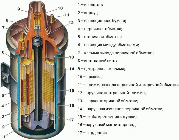 Конструктивно катушка ВАЗ 2109 состоит из пары обмоток — вторичная и первичная.