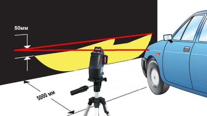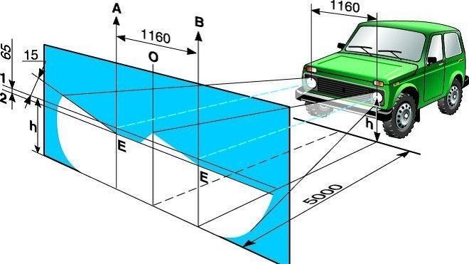 - Ось симметрии машины обозначена как О; Центр правой и левой фар обозначены буквами А и В; Цифра 1 обозначает высоту над полом; Под номером 2 линия, которая расположена внизу под первой на 120 мм, а если в машине установлен гидрокорректор, она находится уже ниже на 65 мм. Перед началом регулировочных работ нужно поставить ручку гидрокорректора в положение, когда самая минимальная нагрузка. Автомобиль перед этим устанавливается на площадке на расстоянии равном 5 метров от щита или стены. После этого можно приступать к регулировке.