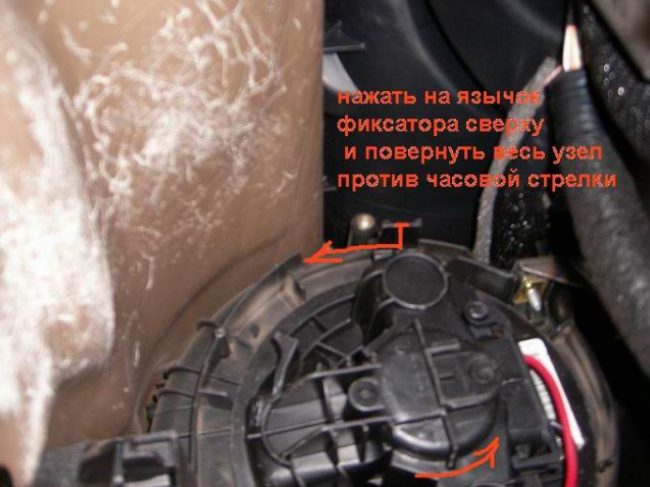 - Электромотор с вентилятором держится на пластиковых фиксаторах. Чтобы извлечь его, необходимо надавить на язычок фиксатора, а затем повернуть мотор против часовой стрелки.
