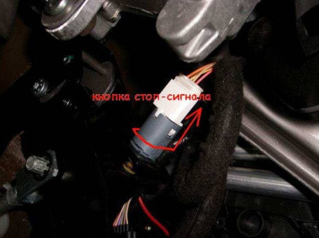 Отсоединяем разъем с педали газа. Снимается так: Снимаем педаль тормоза. После этого следует внимательно осмотреть пространство под панелью. Под ней расположена кнопка стоп-сигнала.