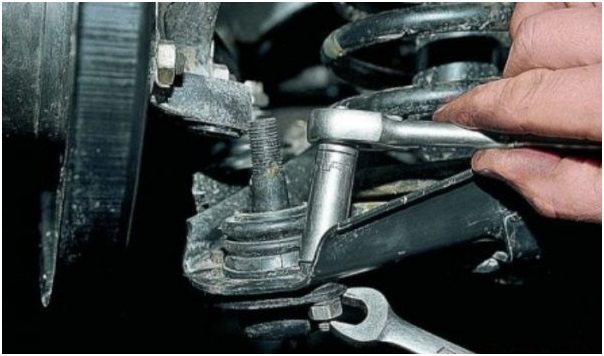 - Рожковым ключом на “13” откручиваются гайки, которые удерживают шаровую опору в проушине, а далее извлекается. С нижней опоры оптимальным вариантом снять крепеж является использование торцового ключа на “13”.