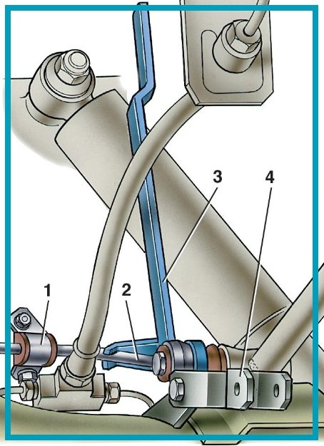 Рис. 7–5. Установка приспособления 67. 7820. 9518 для регулировки регулятора давления задних тормозов: 1 — кронштейн рычага привода регулятора давления; 2 — рычаг привода регулятора давления задних тормозов; 3 — приспособление 67.7820.9518; 4 — тяга соединения рычага привода регулятора давления с кронштейном балки заднего моста