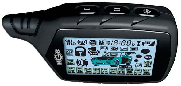 На брелоке, который предназначен для передачи сигналов на дистанции, находится 5 клавиш и экран для вывода сообщений. На дополнительном же брелоке есть только 4 клавиши, применяется он обычно лишь в случае потери основного гаджета.