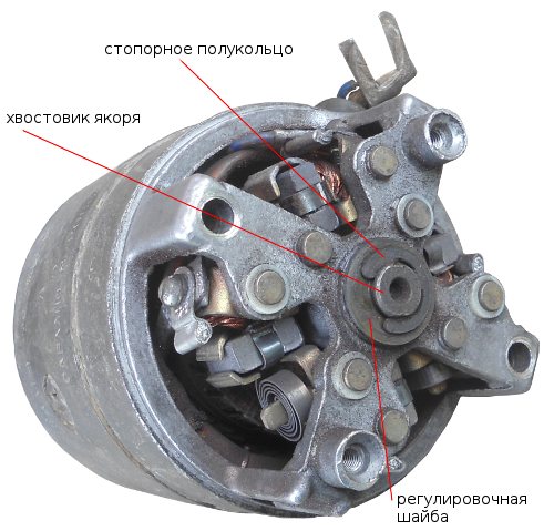 Для этого поддеваем отверткой и снимаем стопорное полукольцо на хвостовике якоря. Так же снимаем находящуюся под ним шайбу.