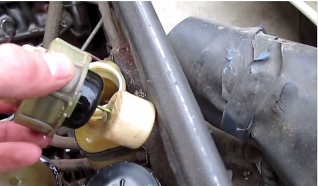 - На бачке главного тормозного цилиндра открутите крышку и положите ее на подготовленную поверхность. Крышка совмещается с поплавком датчика уровня ТЖ, так что будьте внимательно, ибо на нем останется токсичная и опасная субстанция.