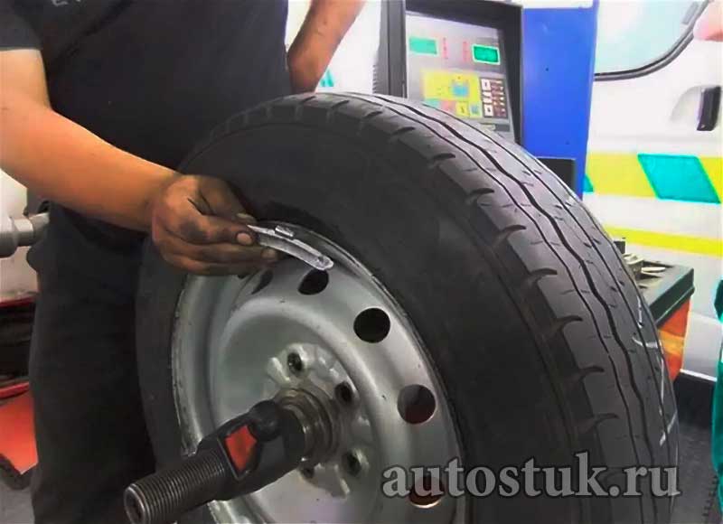 После установки новой шины в диске возникает радиальное биение, спровоцированное несовпадением центра тяжести и оси вращения. Для компенсации этого дефекта на диске закрепляют балансировочные грузы, обеспечивающие равномерное вращение обода. Колесо ставят на балансировочный станок, который вращает диск и фиксирует радиальное биение. Положение компенсирующего груза определяют опытным путем.