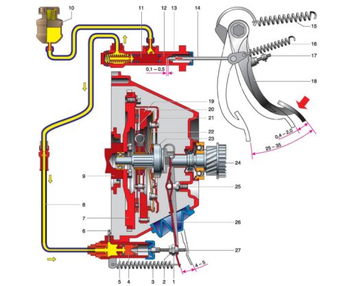 В свою очередь, гидропривод состоит из двух цилиндров: главного и рабочего. При воздействии на педаль, в ГЦ создается давление, вследствие чего тормозная жидкость через клапан нагнетается в рабочий цилиндр (РЦ). Последний приводит в действие шток, который выжимает вилку, тем самым осуществляя выбор передач.