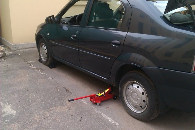 - Поставьте противооткатные упоры на передние колёса и домкратом поднимите заднюю часть машины.