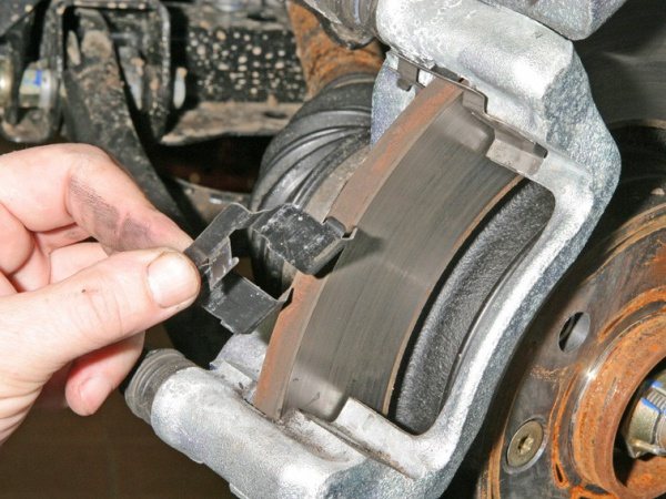 Сперва установите автомобиль на домкрат или подъемник, обеспечив достаточное пространство под ним. Снимите передние колеса, при этом обеспечив доступ за колесный поршень. В этом вам пригодится отвертка с плоским концом. Вставьте его в отверстие суппорта, после чего двигайте цилиндр вовнутрь. Используйте рожковый ключ на 17, чтобы снять основной болт крепления. Подымите скобу суппорта, тем самым освободив колодку. Обе скобы необходимо предварительно снять с крепежей и открутить. Выполните полную очистку посадочного паза от грязи, возможной ржавчины и пыли. На следующем этапе постарайтесь визуально определить износ не только самих тормозных колодок, но и всех близлежащих элементов