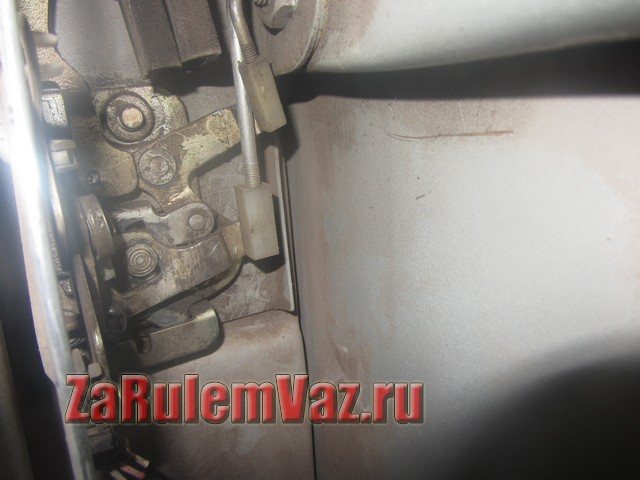 И далее необходимо с внутренней стороны отсоединить две тяги от механизма ручки ВАЗ 2114-2115. Сделать это можно при помощи плоской отвертки, и чем она будет короче, тем удобнее все это делается.