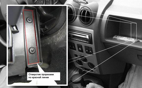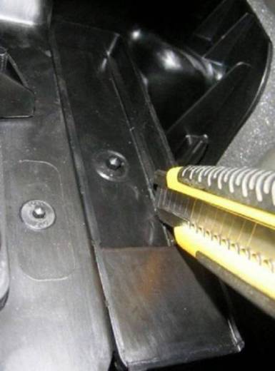 Итак, данная заглушка — это прямоугольник черного цвета, выполненный из пластика, он находится под бардачком чуть правее. Вырезать заглушку надо строго по контуру, который обозначен четкими выпуклыми линиями. Нужно вырезать за 2 этапа. Начать лучше всего с середины, где находится условный назовем его так центр прямоугольника. После этого вырезается квадрат в нижней части, что позволяет не повредить довольно мягкий пластик и не задеть автомобильную проводку.