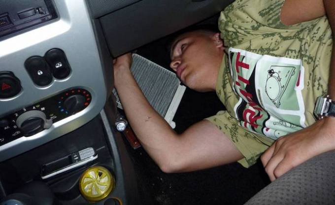 Когда производится замена, вам потребуется лишь пылесос и еще удобный острый нож, это позволит очистить полость. Сразу надо сказать, что работать будет неудобно. Заглушка находится внизу под бардачком, таким образом работать с ней можно только в лежачем положении.