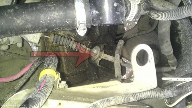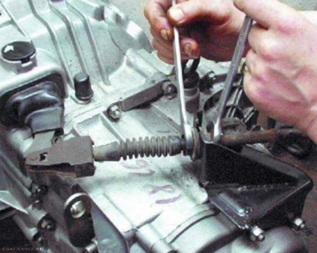 - На КПП находится кронштейн крепления, из него нужно вытянуть трос. Для этого нужны 2 ключа на «19», которыми ослабляют фиксирующие гайки тросика. Натяжение ослабевает, и трос просто вынуть из крепления.