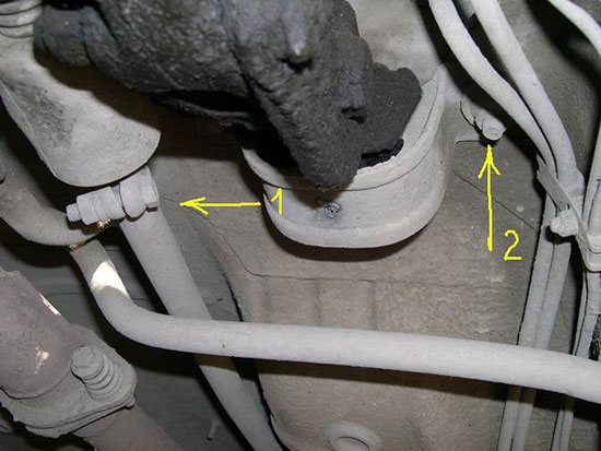 15. Подставьте упору под двигатель, затем открутите две гайки крепления задней подушки. Это делается на всякий случай, чтобы в случае слишком большого опускания мотора у вас не порвало шланги.