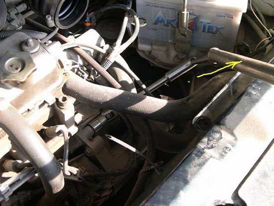 - Теперь получаем доступ к верхним болтам крепления коробки передач. Откручиваем длинный болт – сзади, короткий – спереди.
